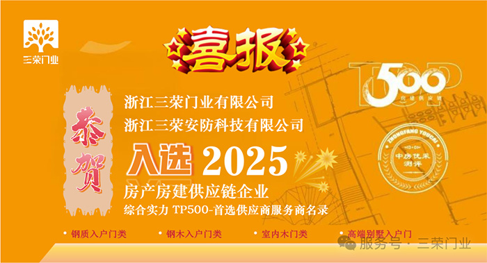 三荣门业旗下:钢质入户门类、钢木入户门类、室内木门类、高端别墅入户门凭借领先的综合实力入选2025房建供应链企业综合实力TP500-首选供应商服务商名录。这不仅是三荣稳健经营实力的证明,更是房地产业界对三荣品牌及匠心品质的肯定。