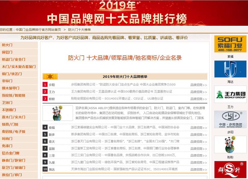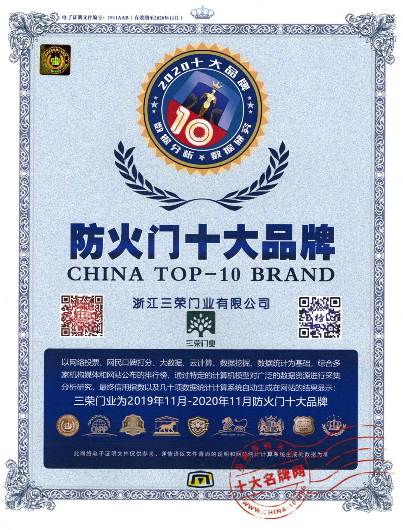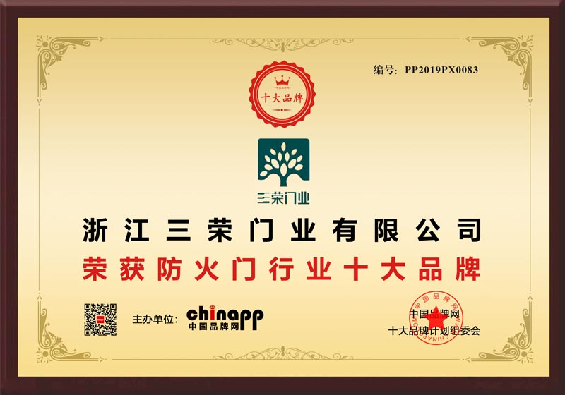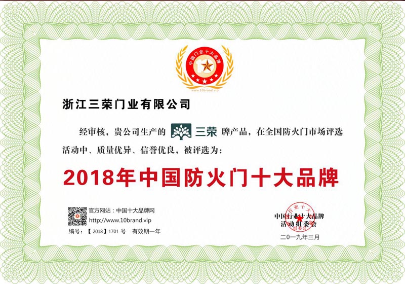 喜讯:荣誉见证实力三荣门业荣获防火门、防盗门十大品牌
