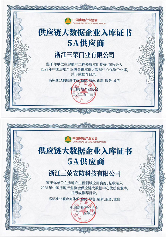 三荣门业旗下:钢质入户门类、钢木入户门类、室内木门类、高端别墅入户门凭借领先的综合实力入选2025房建供应链企业综合实力TP500-首选供应商服务商名录。这不仅是三荣稳健经营实力的证明,更是房地产业界对三荣品牌及匠心品质的肯定。